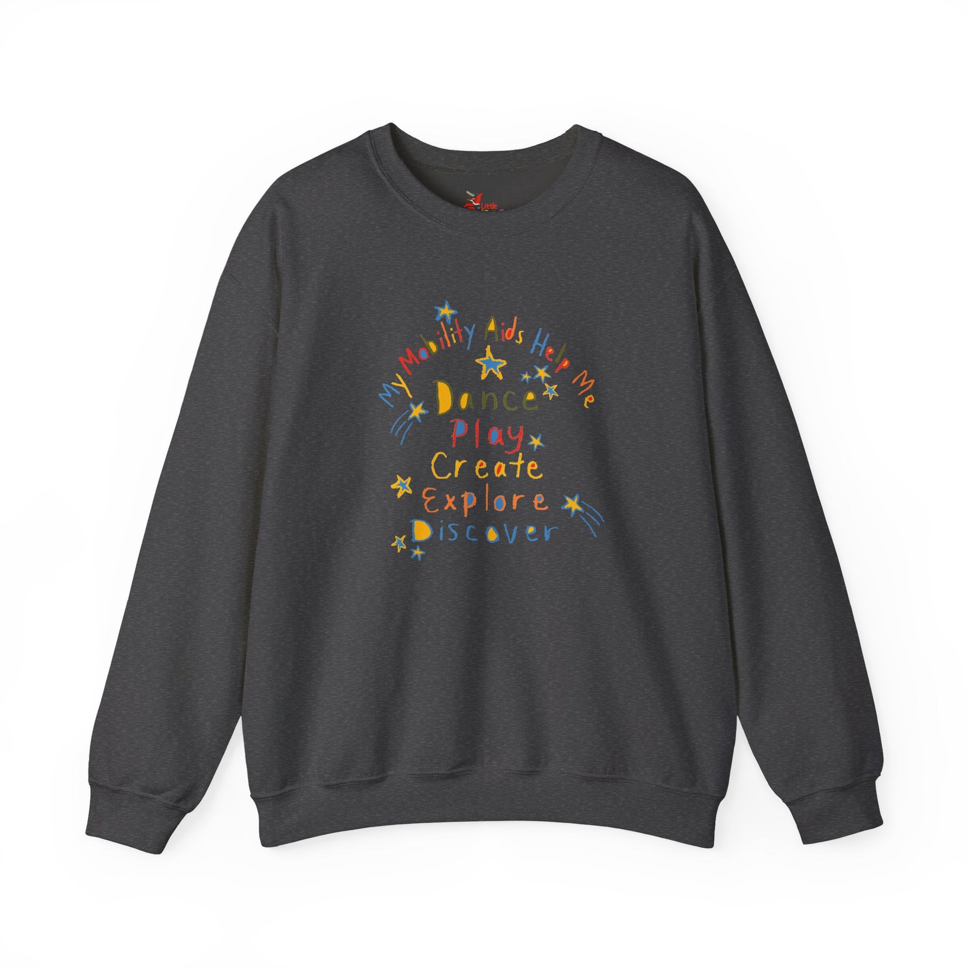For disabled kids, mobility aids are freedom! Our mobility aids help us dance, play, create, explore, and discover. Build confidence and celebrate mobility aids with this colorful crewneck.